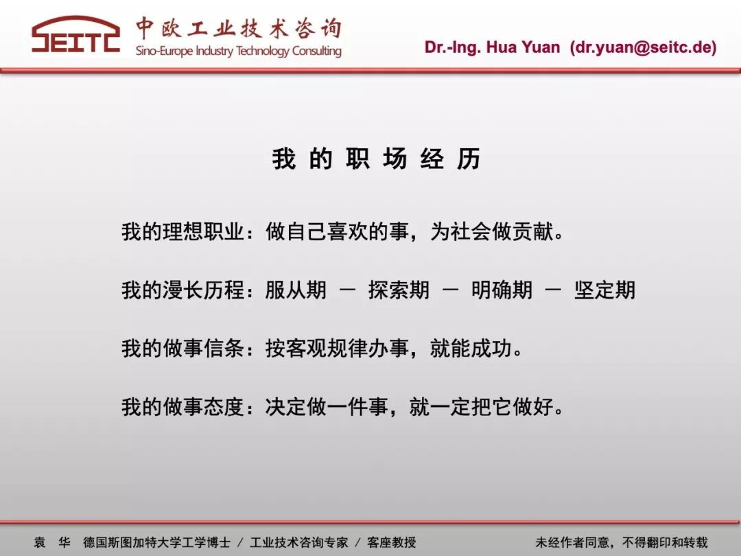 享受工作,奉献社会 —— 这是德国中欧工业技术咨询公司首席咨询顾问、曾长期担任夹具技术与抓取系统的全球“隐形冠军”德国雄克公司大中华区总经理的袁华博士的人生信条。袁博士将其奋斗四十余载的职业经历浓缩成精华,归纳为“服从期 - 探索期 - 明确期 - 坚定期”四个阶段,通过平易近人的生动演讲与听众们进行了分享。