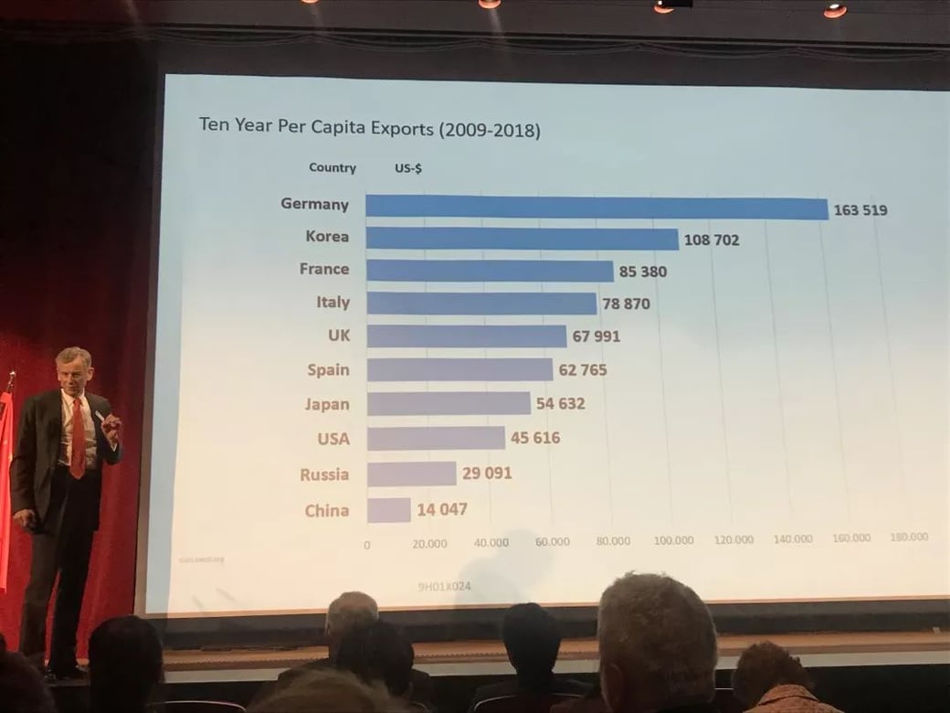 西蒙教授指出,在过去的十年中(2009 - 2018),中美两国在出口贸易总量方面表现突出,分居第一和第二,德国屈居第三。但就人均出口量而言,德国以绝对优势居于第一,数倍于美中,美国和中国反居第八与第十。