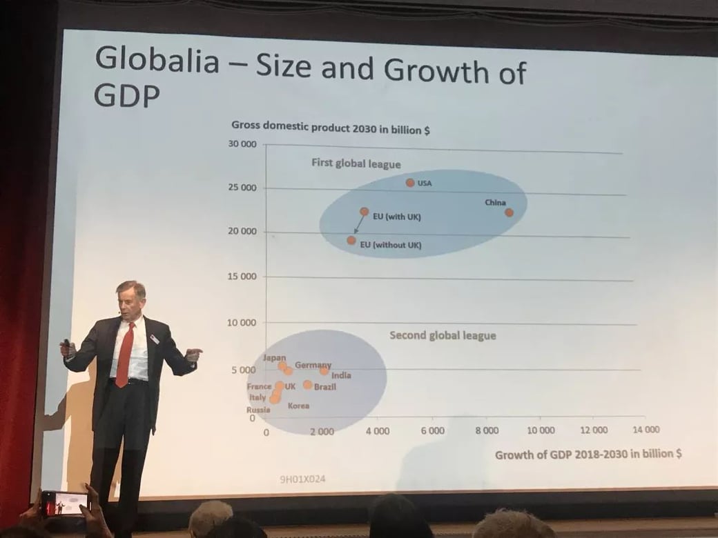西蒙教授还预测:截至 2030 年,美国、中国与欧盟将在 GDP 的规模与增长上位列全球经济的“甲级队”,约占全球 GDP 总量的 60%。若英国脱欧成功,欧盟 GDP 将明显下滑。若将欧洲各国与欧盟分开统计,“甲级队”里德国榜上无名,将与日本、印度、法国等国家位列“乙级队”。