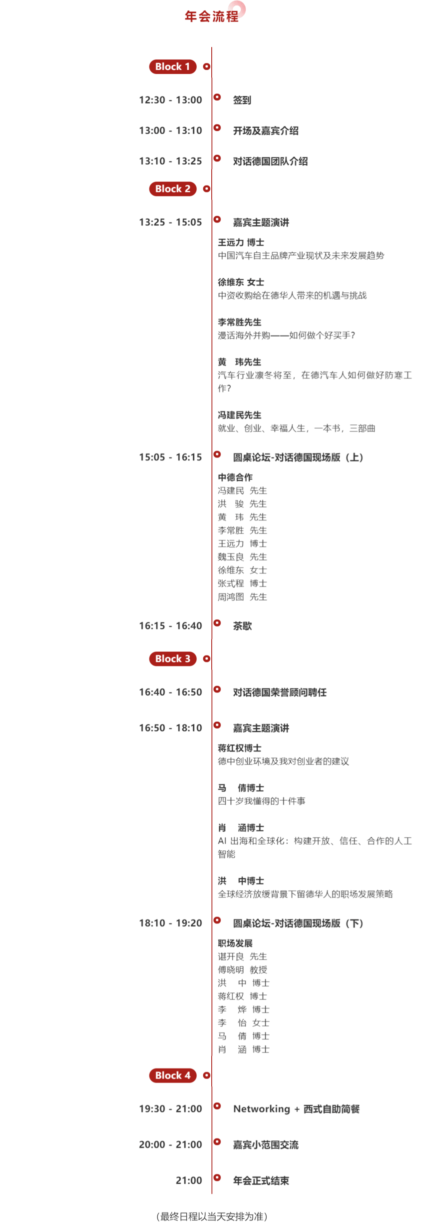 3. 由于场地限制,今年年会参与人数最多无法超过 250 人。如今年无法到场,欢迎你参加我们明年的年会。今年年会的精彩内容将会通过对话德国公众号分享,敬请关注。