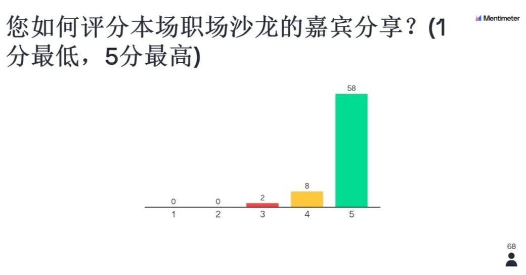 考虑到线上互动的局限性,我们在大量的调研工作后,最终选定了 Mentimeter 这个在线互动软件。参会者只需要扫描二维码,就可以在线实时参与问题的讨论,大家的答案也会被实时投放在大屏幕上,屏幕右下角会实时显示参与投票的人数。