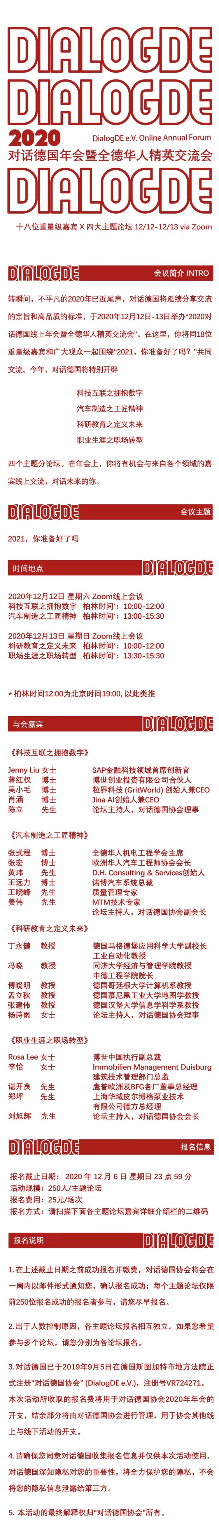 在此,对话德国将举办 2020 年线上年会,与 18 位各行各业的优秀嘉宾共同探讨四大主题。也希望能借此机会结识更多优秀的伙伴一起对话德国,通过交流碰撞出更多值得分享的观点与见解,共同成长。
